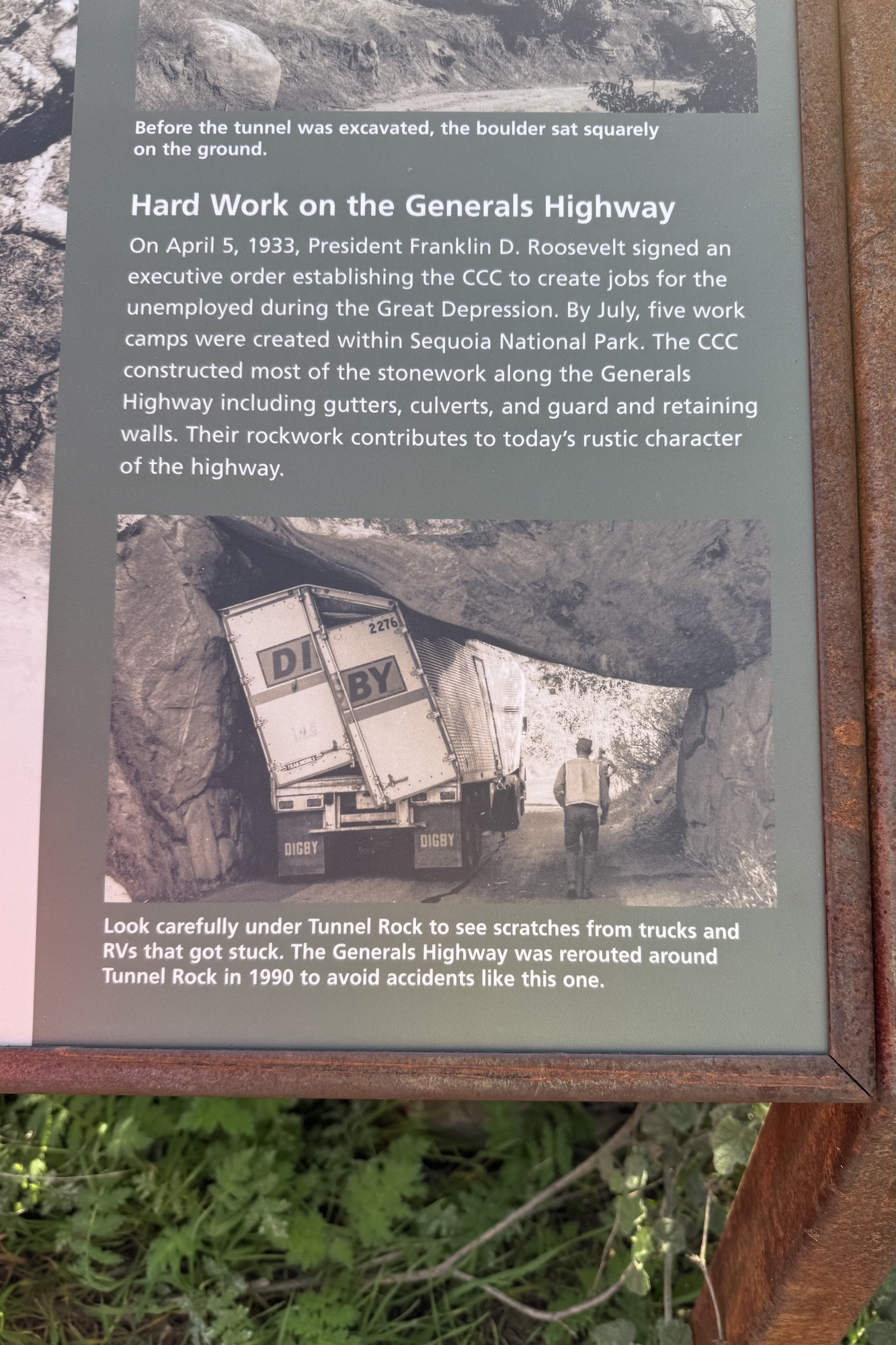 Just off the Generals Highway in Sequoia National Park, Tunnel Rock is an easy roadside curiosity worth a quick stop. This massive granite boulder fell down creating a tunnel of sorts, and early park builders routed traffic through it. After numerous traffic issues, they eventually rerouted traffic around it. Short paths let you walk around and under the rock, giving a sense of its scale. Interpretive signs explain its geology and history. It’s a fast, low-effort stop that breaks up the drive nicely.